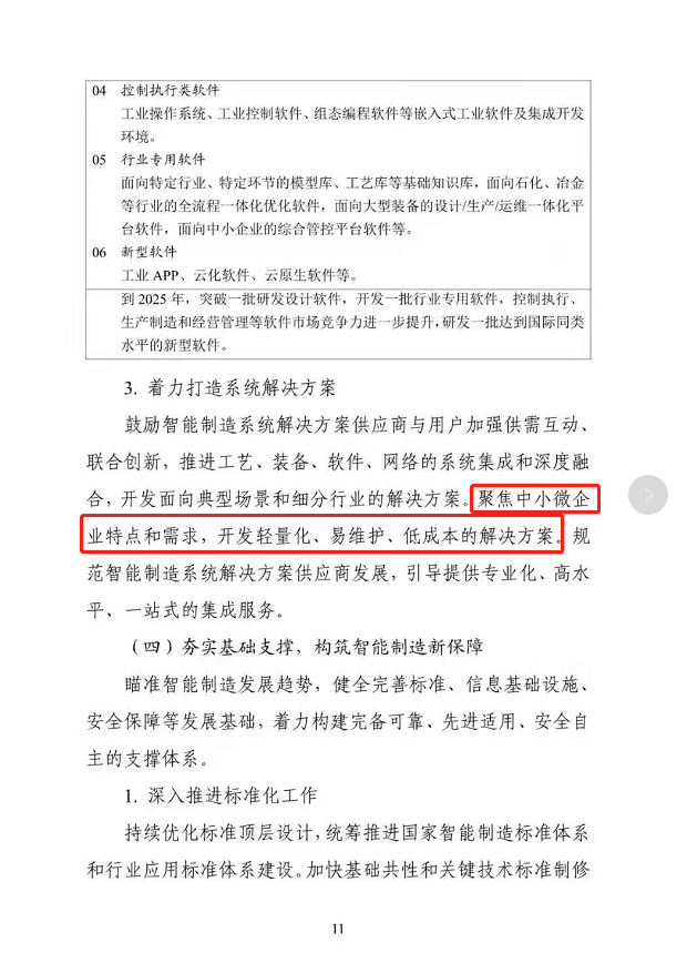 4月14日,工業(yè)和信息化部公開對《“十四五”智能制造發(fā)展規(guī)劃》征求意見。征求意見稿提出,智能制造發(fā)展水平關(guān)乎我國未來制造業(yè)的全球地位,對于加快發(fā)展現(xiàn)代產(chǎn)業(yè)體系,鞏固壯大實體經(jīng)濟(jì)根基,構(gòu)建新發(fā)展格局,建設(shè)數(shù)字中國具有重要作用。目前工信部倡導(dǎo)的方向:聚焦中小微企業(yè)特點和需求,開發(fā)輕量化、易維護(hù)、低成本的解決方案。