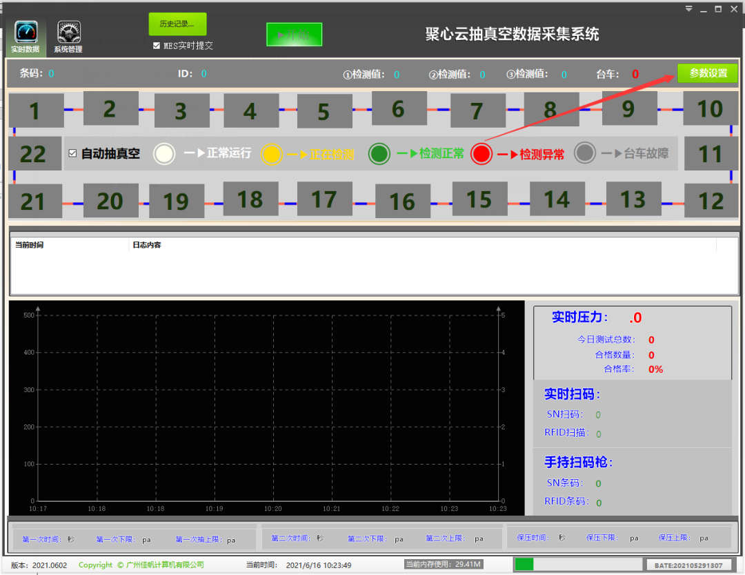 在生產(chǎn)過程中,聚芯云抽真空數(shù)據(jù)采集控制系統(tǒng)實時采集壓力參數(shù),生成曲線變化顯示圖;生產(chǎn)數(shù)據(jù)實時化的同時,可通過人性化交互界面進行數(shù)據(jù)監(jiān)控,后續(xù)同步云端完成數(shù)據(jù)記錄與分析處理,實現(xiàn)不良品的自動排出。